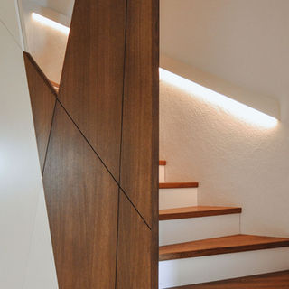 We clearly sensed his team's enthusiasm, and it was fascinating to see how the furniture was created and to touch the wood. This made the whole thing tangible, to come alive. And it gave us ideas. After all, there was a lot to change. It started with the staircase made of wood and glass elements, which extends over three floors. Recently, the matching door between the hallway and the living area followed. What also struck us positively about this project: bulbaum thinks across trades. When it came to the LEDs in the staircase, Mr. Tossing personally contacted our electrician to ensure that everything worked as planned. Working with bulbaum is simply a pleasure. That's why it was a given who we would call first for bathroom furniture or the large bench in the dining room. And just recently, we commissioned our hallway wardrobe from bulbaum. We'll see what comes next! As I said, renovating a house is a lifelong project.