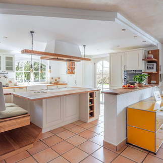 Diese Küche im Landhausstil vereint zeitlose Eleganz mit einer warmen, einladenden Atmosphäre. Charakteristisch sind die liebevoll gestalteten Fronten mit klassischen Rahmen und feinen Details, die dem Raum einen wohnlichen und authentischen Charakter verleihen. Im Mittelpunkt steht die massive Arbeitsplatte, die nicht nur durch ihre hochwertige Optik besticht, sondern auch Robustheit und Langlebigkeit garantiert. Natürliche Materialien und harmonisch abgestimmte Farbtöne schaffen ein behagliches Gesamtbild, das zum Verweilen und gemeinsamen Kochen einlädt.